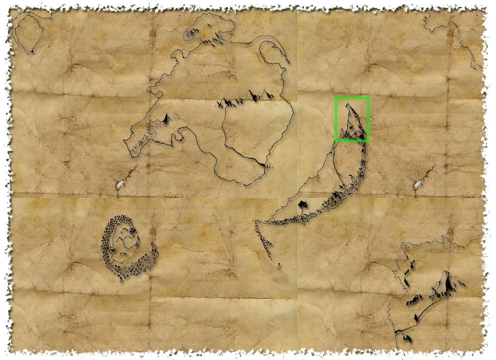 Las tierras baldías de Gneiden al completo. No tiene ningún sentido adentrarse más allá del Último refugio puesto que es imposible empezar la campaña en ningún lugar apartado del recuadro en verde. Se supone que nadie conoce la existencia más allá de la Última frontera. Pero se muestra de todas formas aquí: