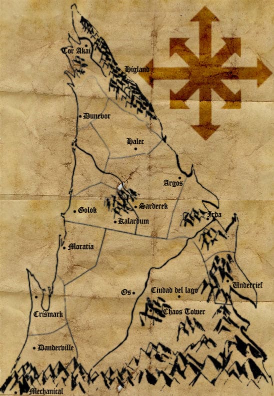 ¡Toma ya!, recuperación milagrosa de entre la mierda de mi cuarto. Le quitamos las manchas de nicotina con el photoshop y ¡voilà!, ya tenemos el mapa de "El Último resquicio", la parte conocida por los humanos de Gneiden, puesto que hace siglos que se cercó la última frontera, y a la gente del mundo conocido le gusta hablar más de la cuenta, y claro, pasa que ya no se sabe por qué tanto miedo a traspasar la frontera, que por otro lado ya es jodido de por sí.
